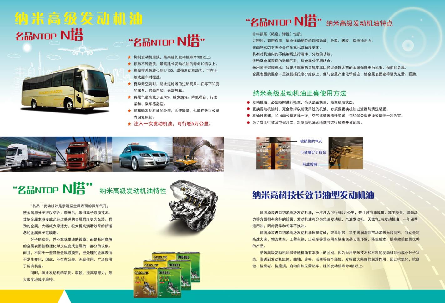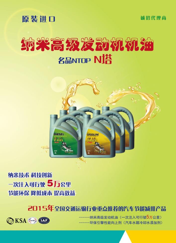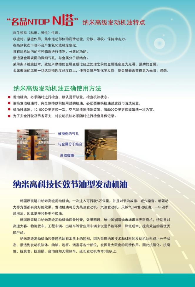 原装进口名品NTOP(N塔)牌纳米高级发动机油,就是高科技长效节油性全合成润滑油,一次注入可行驶5万公里,是应用纳米技术和材料的节能减排环保产品。