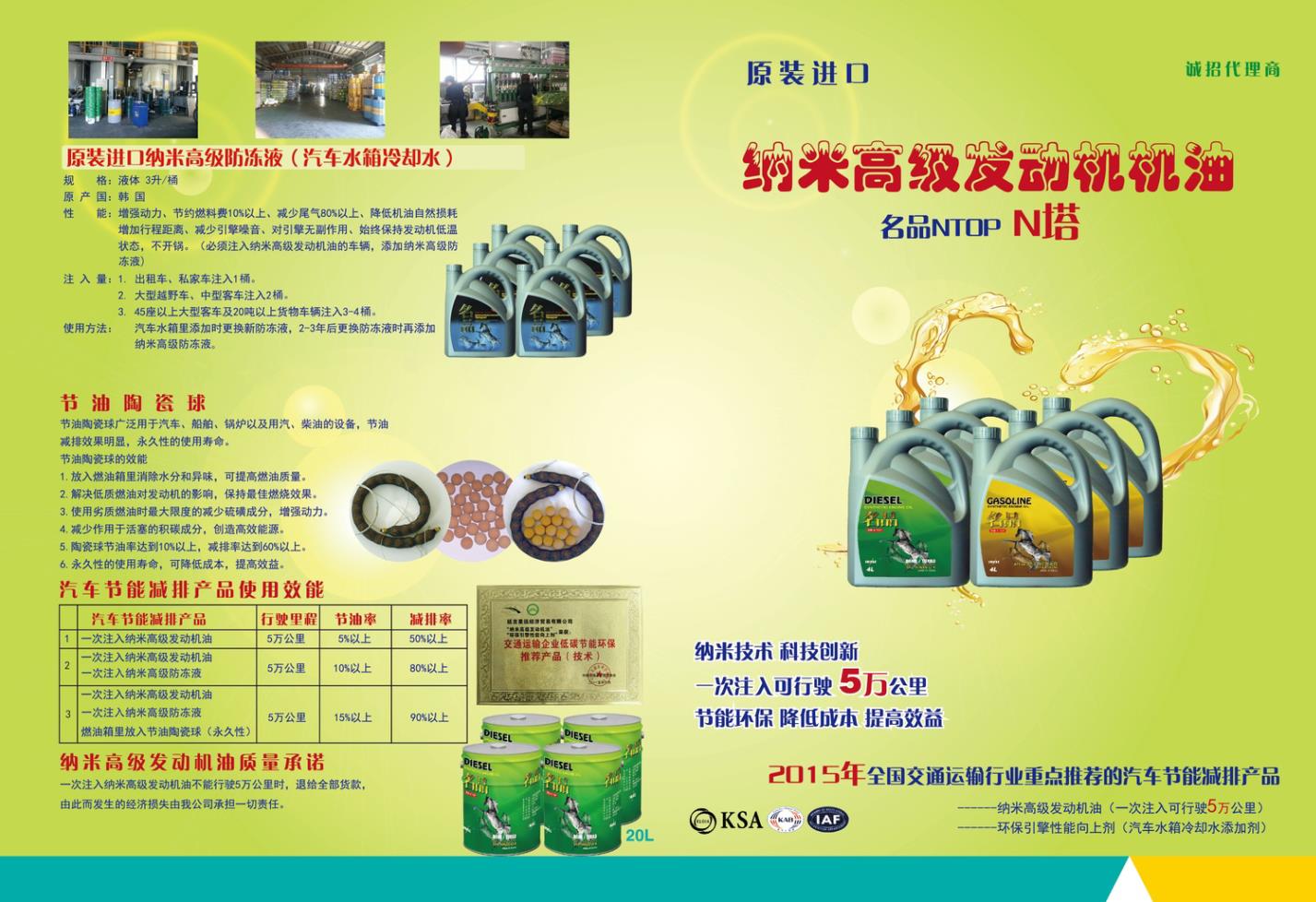4.纳米高级发动机油在2015年获全国交通运输行业重点推荐的汽车节能减排产品。